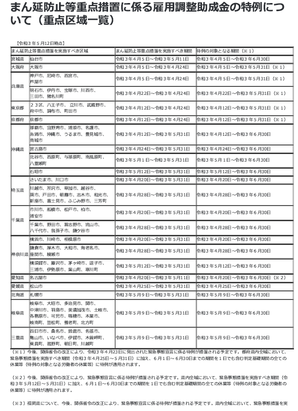 R3.4.30に、号外R3-1号 「令和3年5月・6月の 雇用調整助成金の特例措置等について」を緊急に情報提供を致しましたが、特例内容に変更ありませんが、まん延防止等重点措置の対象区域が大幅に増えましたので、5/12に追加公表された地域をご紹介します。